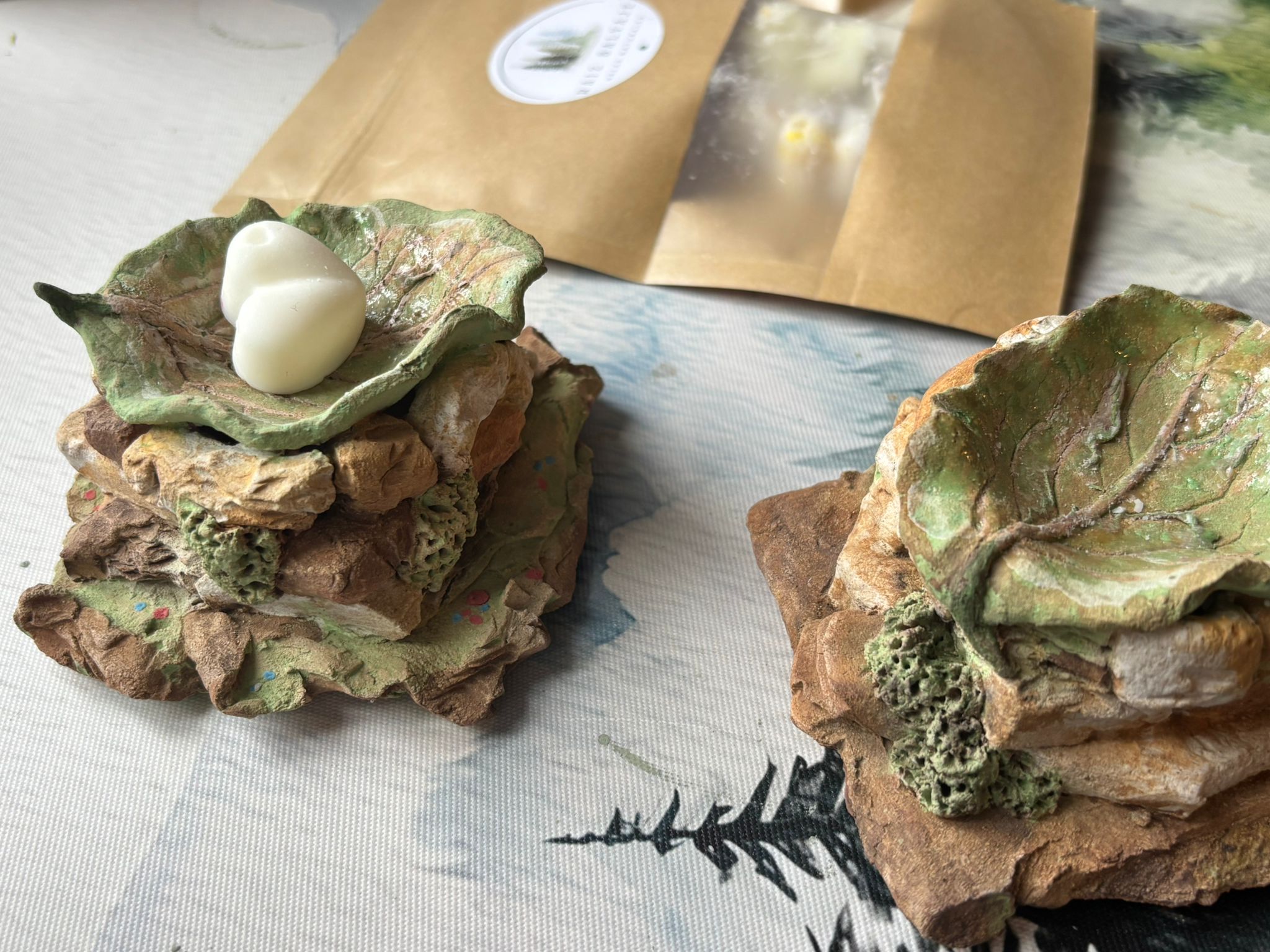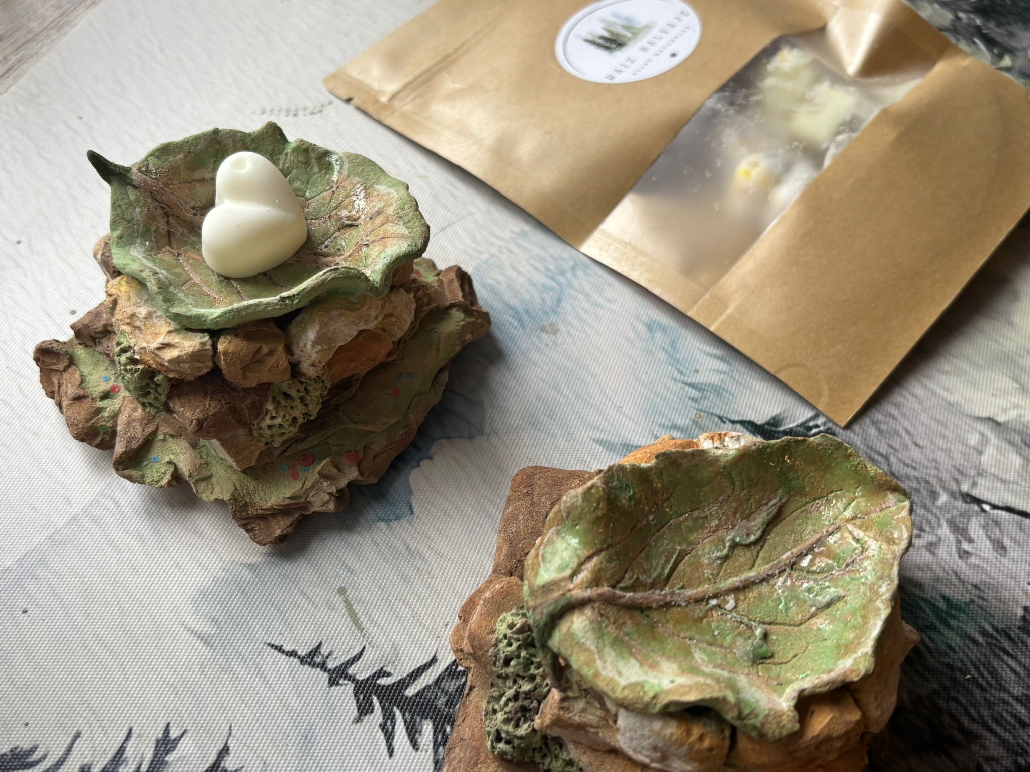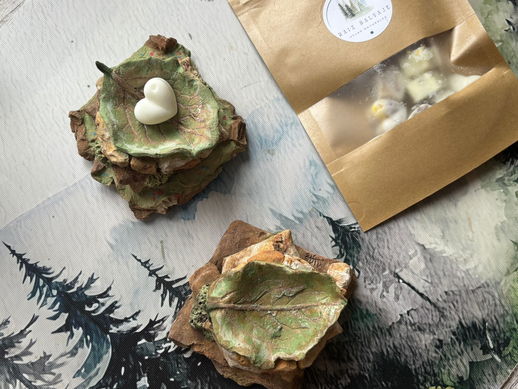 Quemadores de barro refractario de los artesanos, Alfil Cerámica. Con elementos del bosque, una representación en la que está inspirada la marca, Raiz Salvaje.