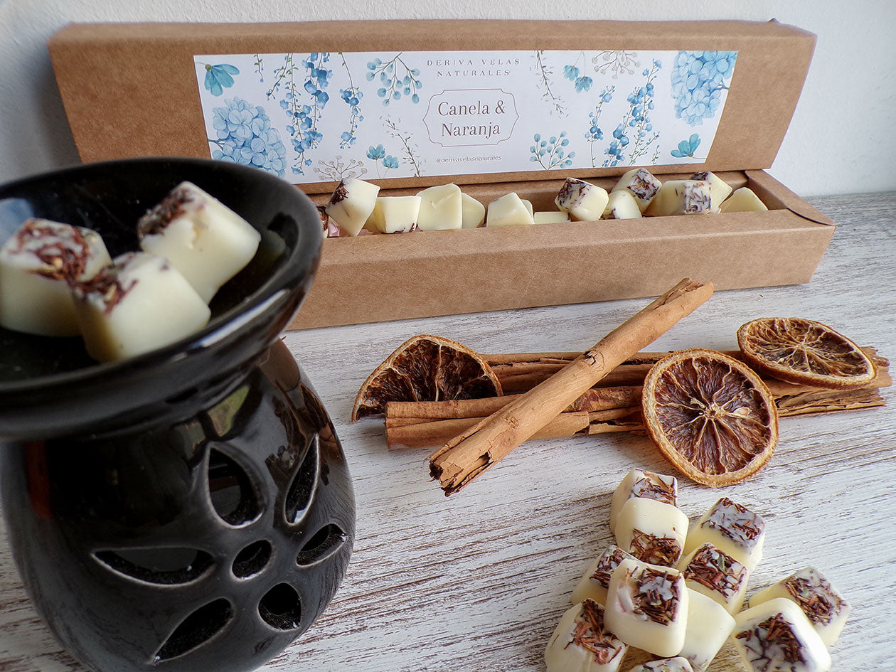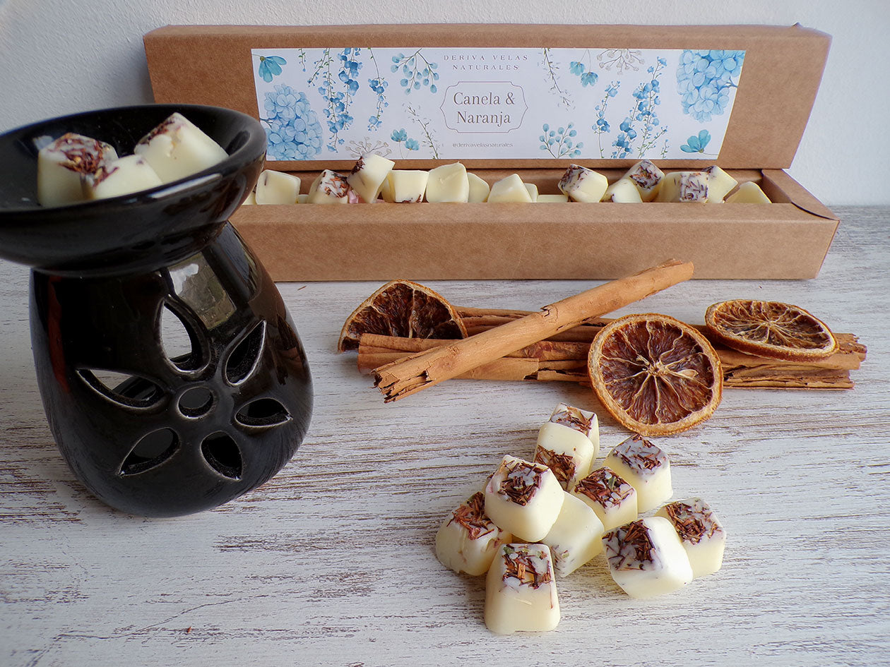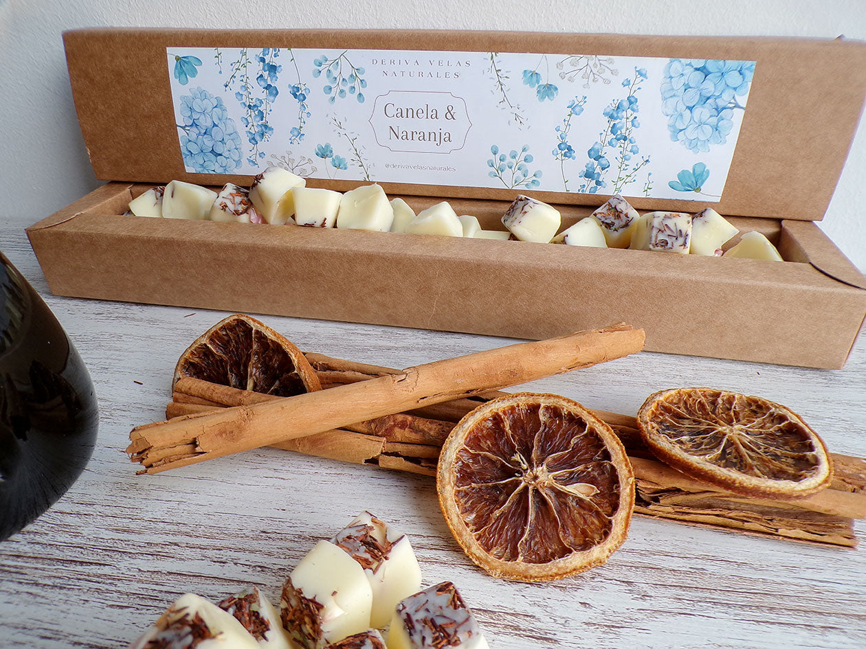 22 rocas de cera de soja, con aroma a Canela & Naranja. Cada roca está elaborada de manera individual, por lo que los pétalos de flores, recolectadas del huerto propio, las convierten en Max melts diferentes.