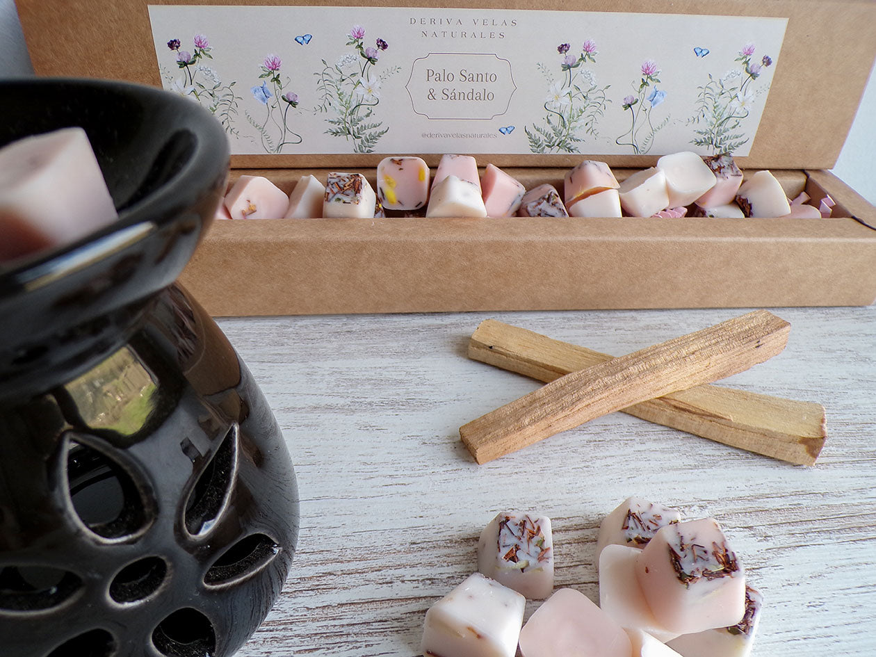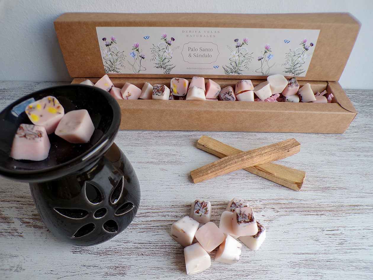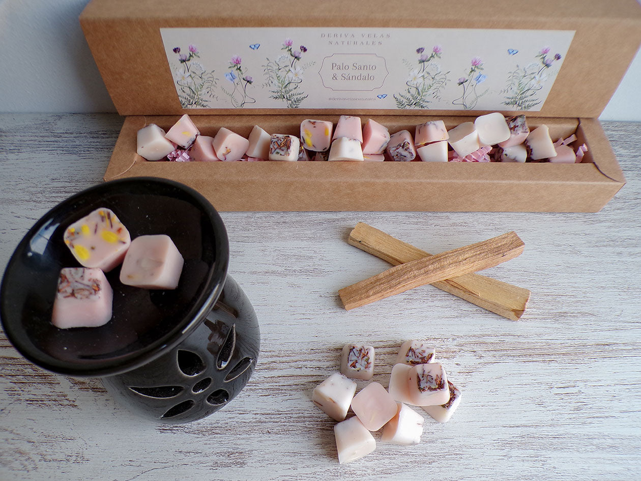22 rocas de cera de soja, con aroma a Palo Santo & Sándalo. Cada roca está elaborada de manera individual, por lo que los pétalos de flores, recolectadas del huerto propio, las convierten en Max melts diferentes.