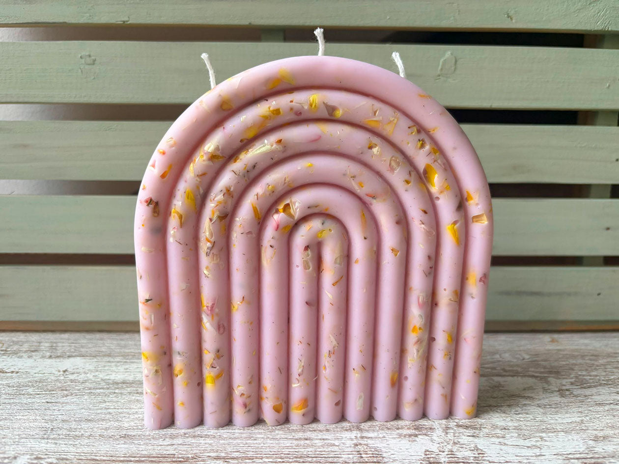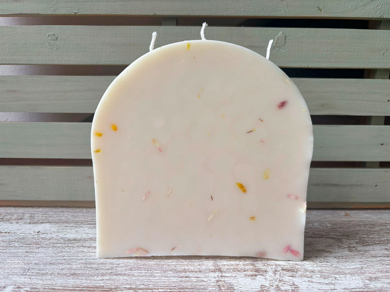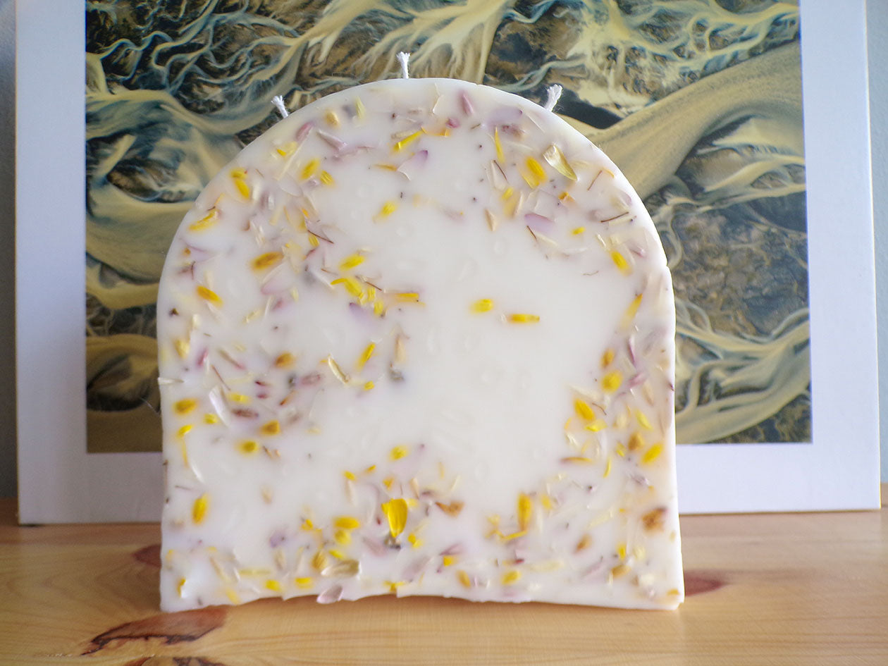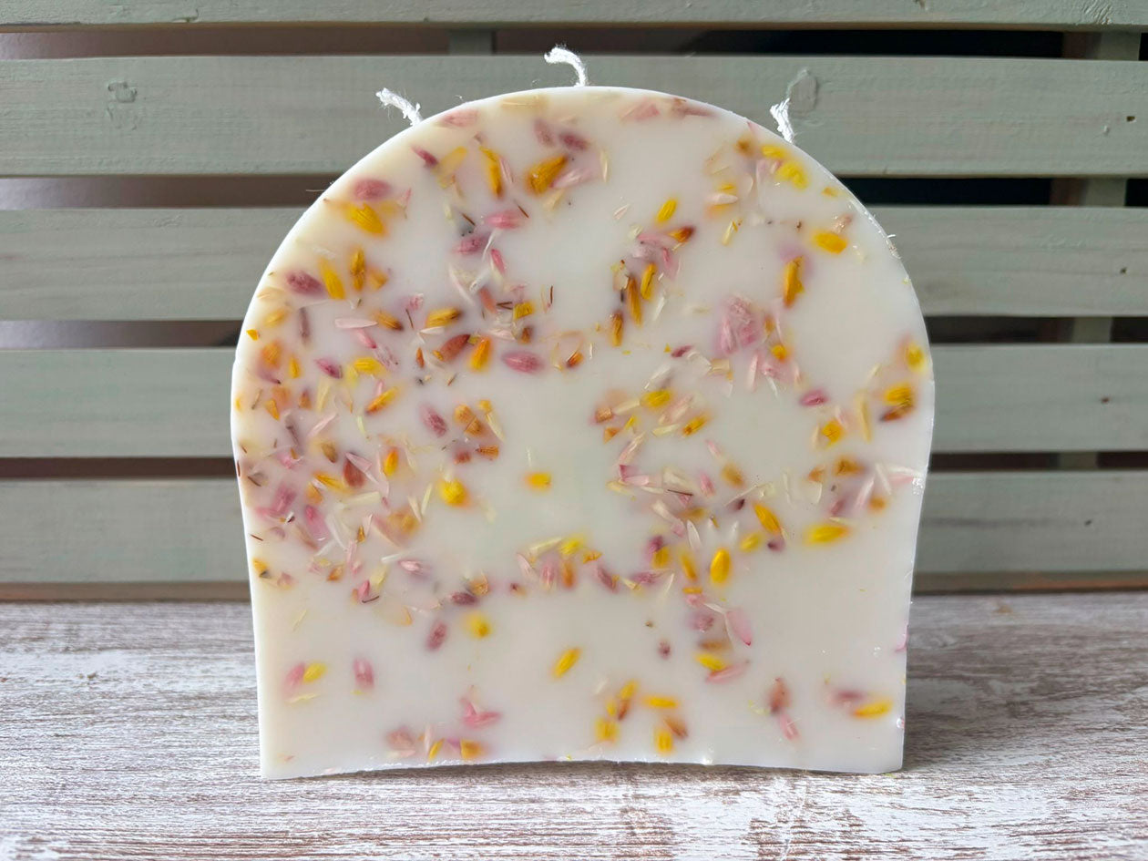 Una vela decorada con pétalos de flores naturales, cultivadas en huerto propio. Además de distintos pigmentos. 300 gr de vela, que podrá decorar su hogar a la vez que inundar de un suave aroma la estancia.