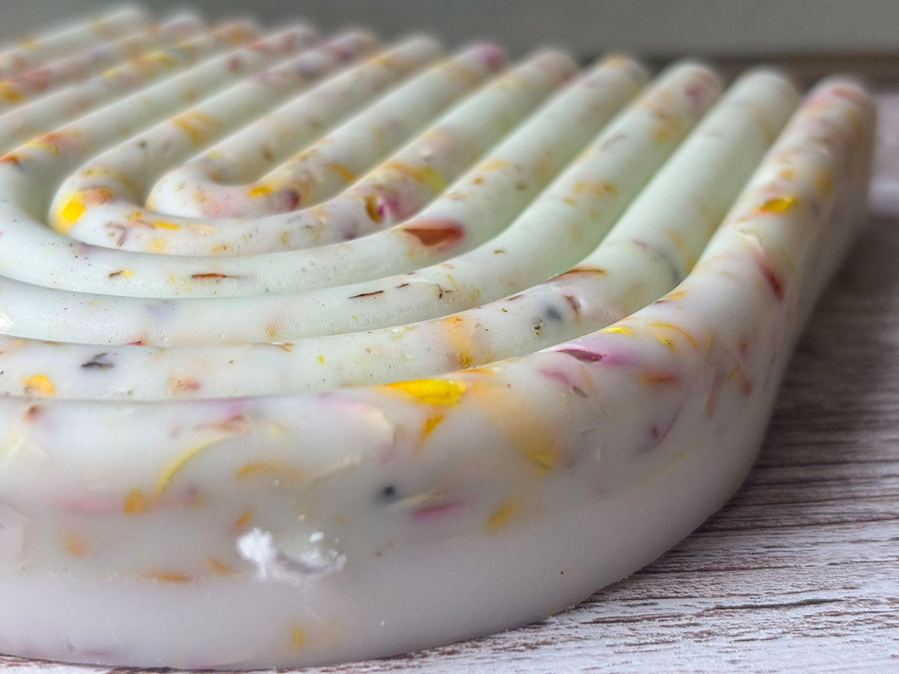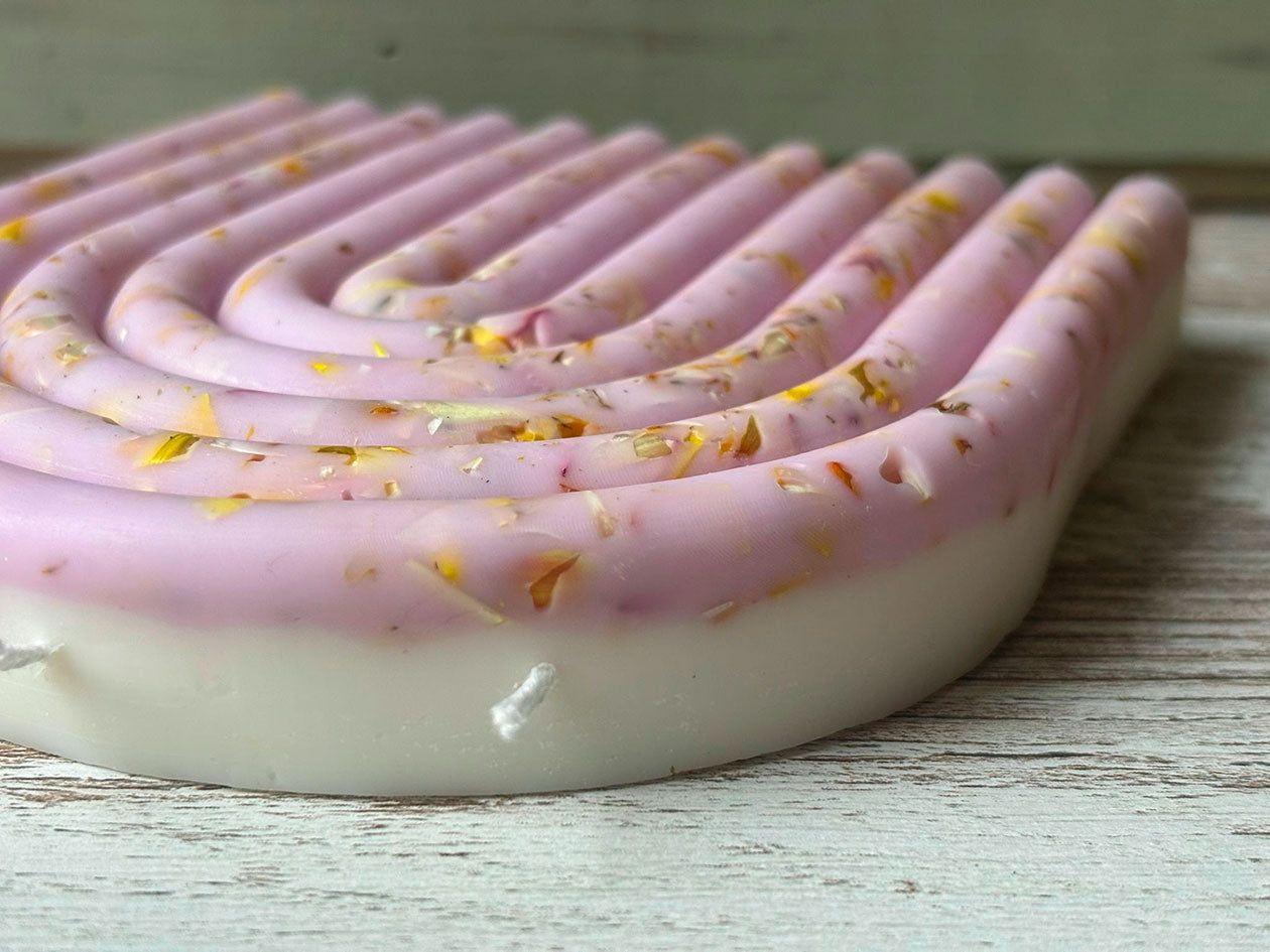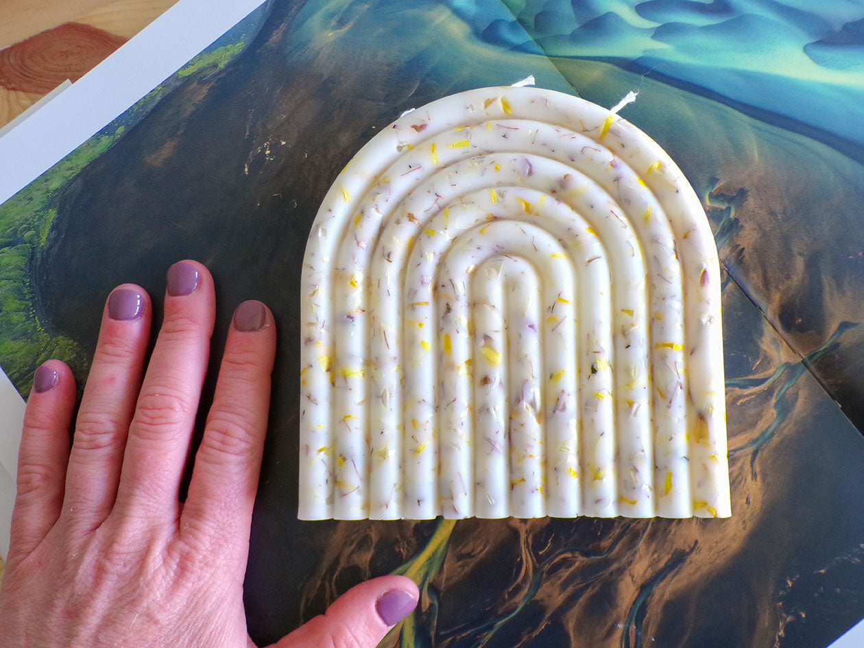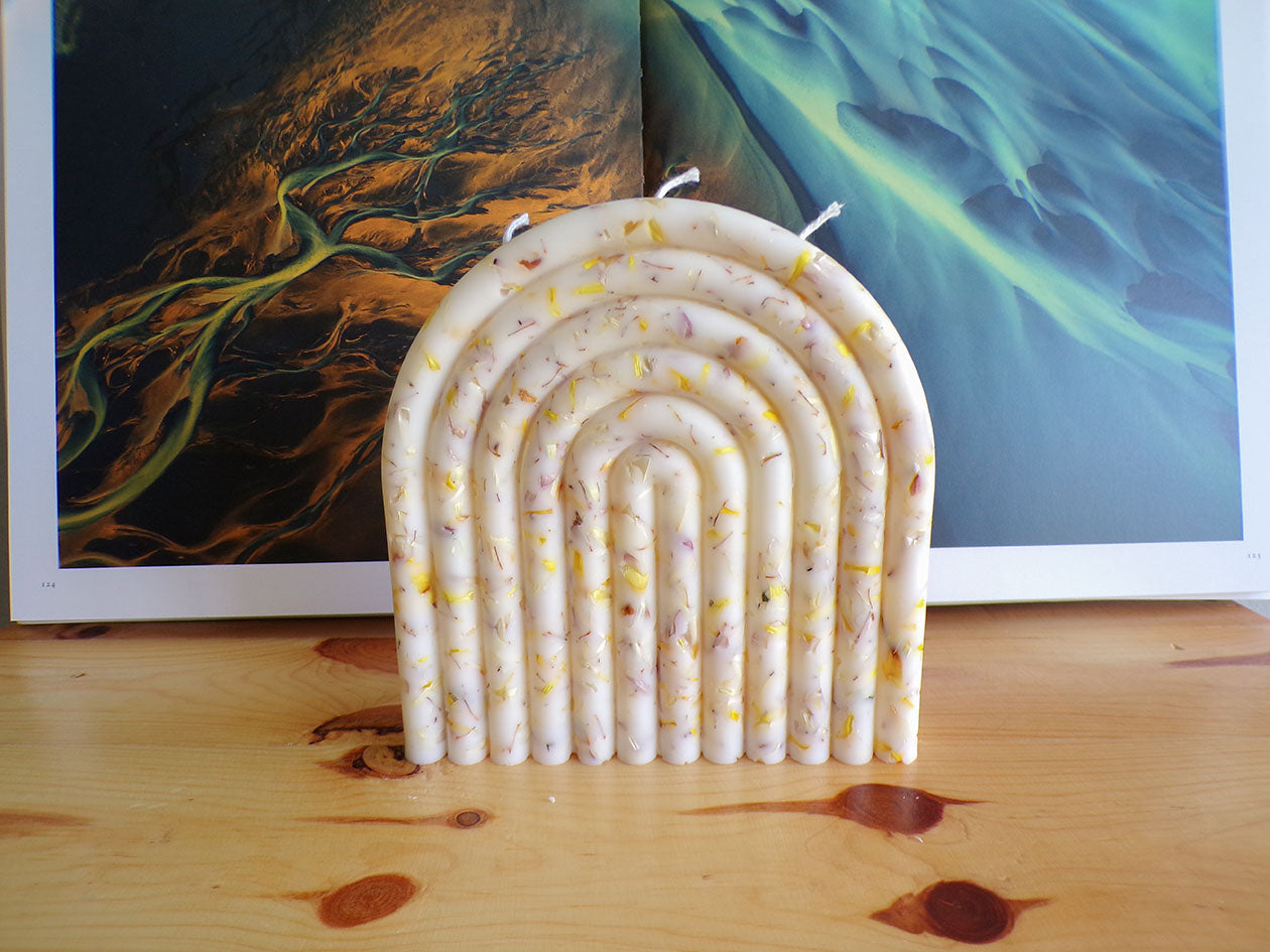 Una vela decorada con pétalos de flores naturales, cultivadas en huerto propio. Además de distintos pigmentos. 300 gr de vela, que podrá decorar su hogar a la vez que inundar de un suave aroma la estancia.