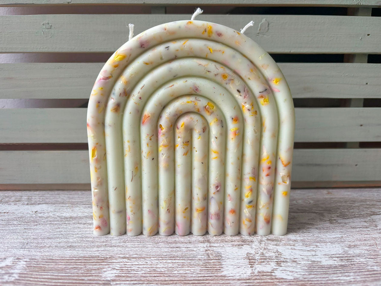 Vela arcoíris, elaborada con cera de soja de alta calidad, con un aroma a azafrán sagrado.
