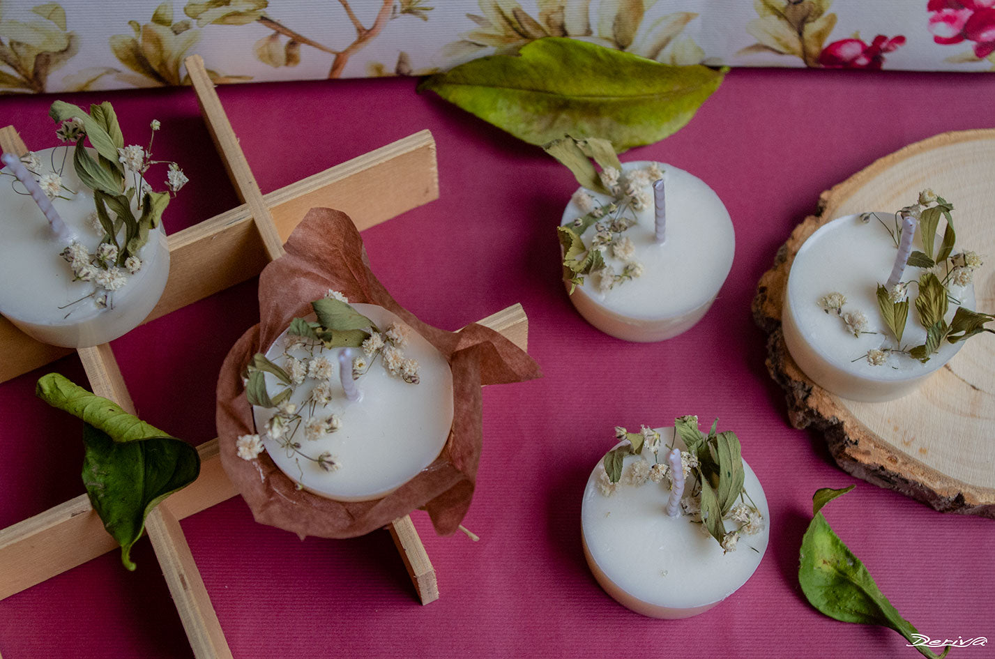 Regala en tu boda, una mini vela, decorada con flores naturales secas.