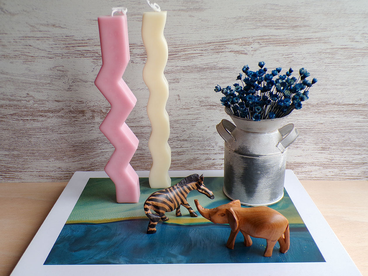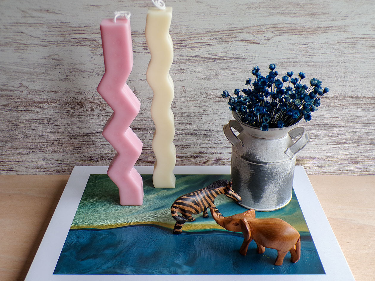 Vela de cera de soja, con aroma a Flor de Loto. Puedes seleccionar entres dos formas en velas geométricas, onda o zigzag.