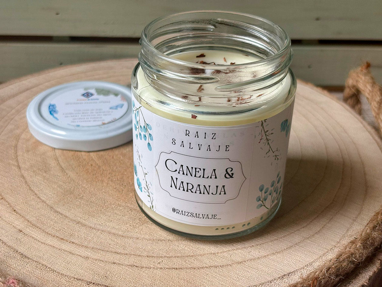 Velas naturales de cera de soja. Podrás elegir entre una gran variedad de esencias. Viene en un recipiente de vidrio con tapa. Decorada en la parte superior con flores secas.
