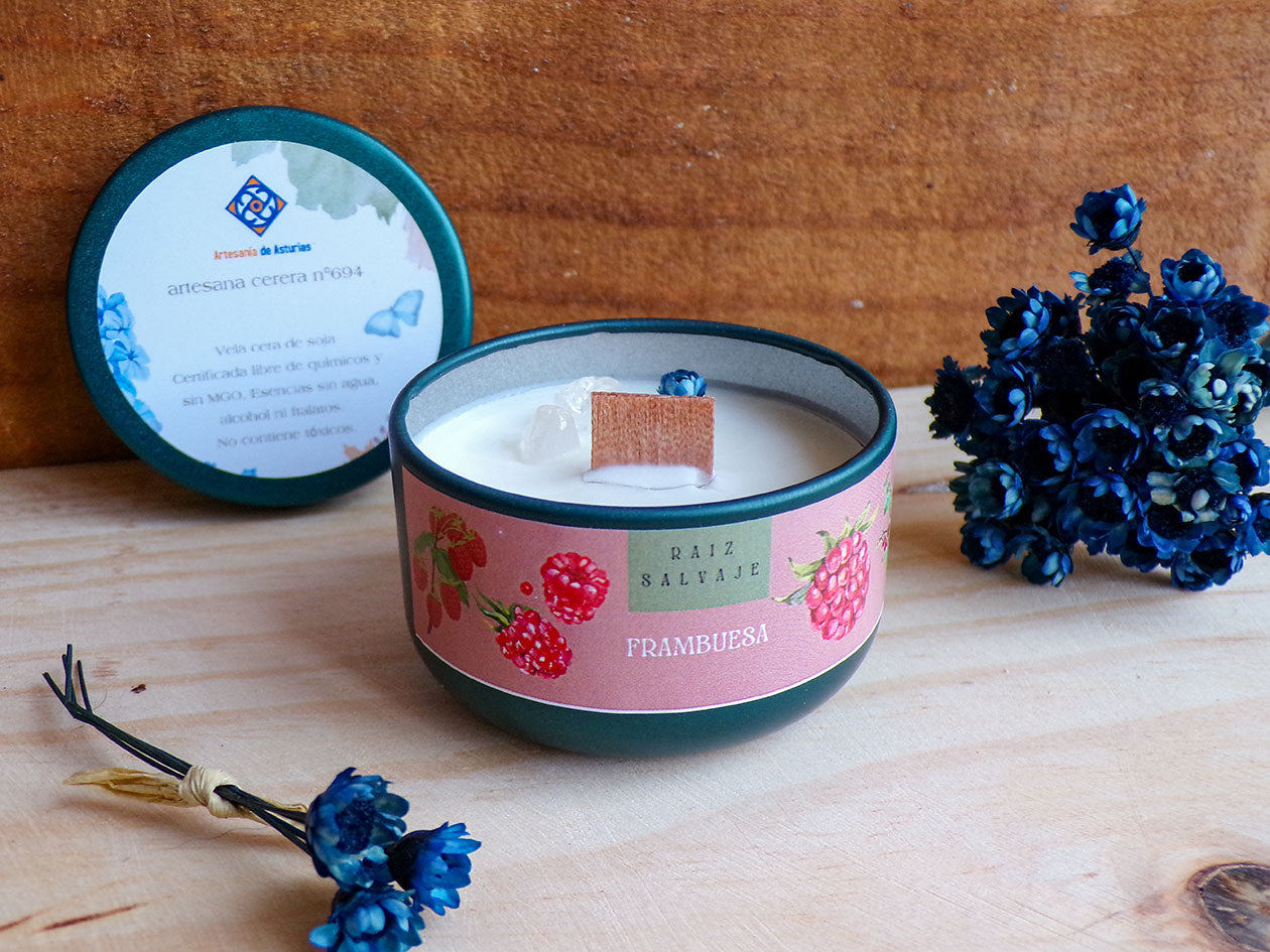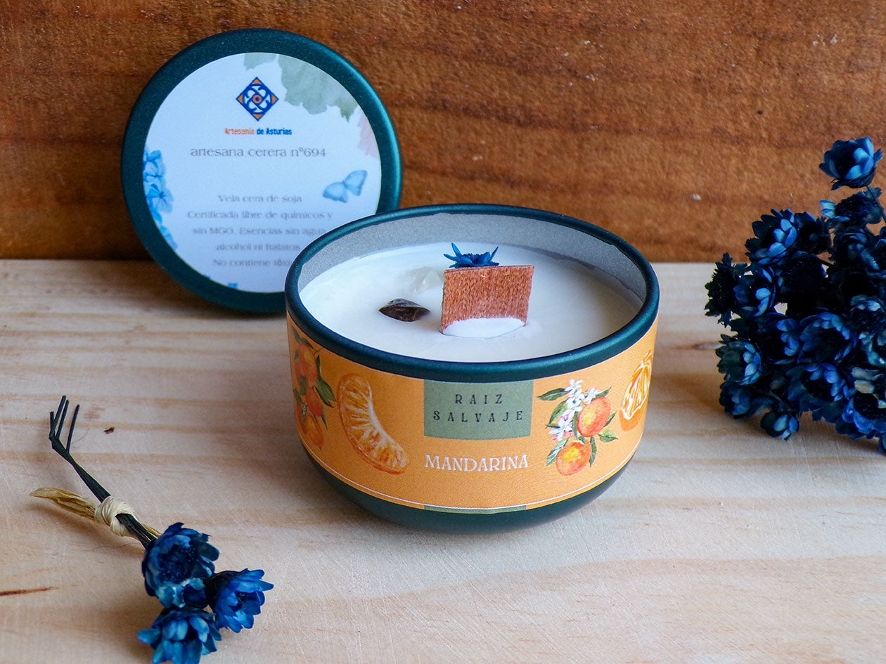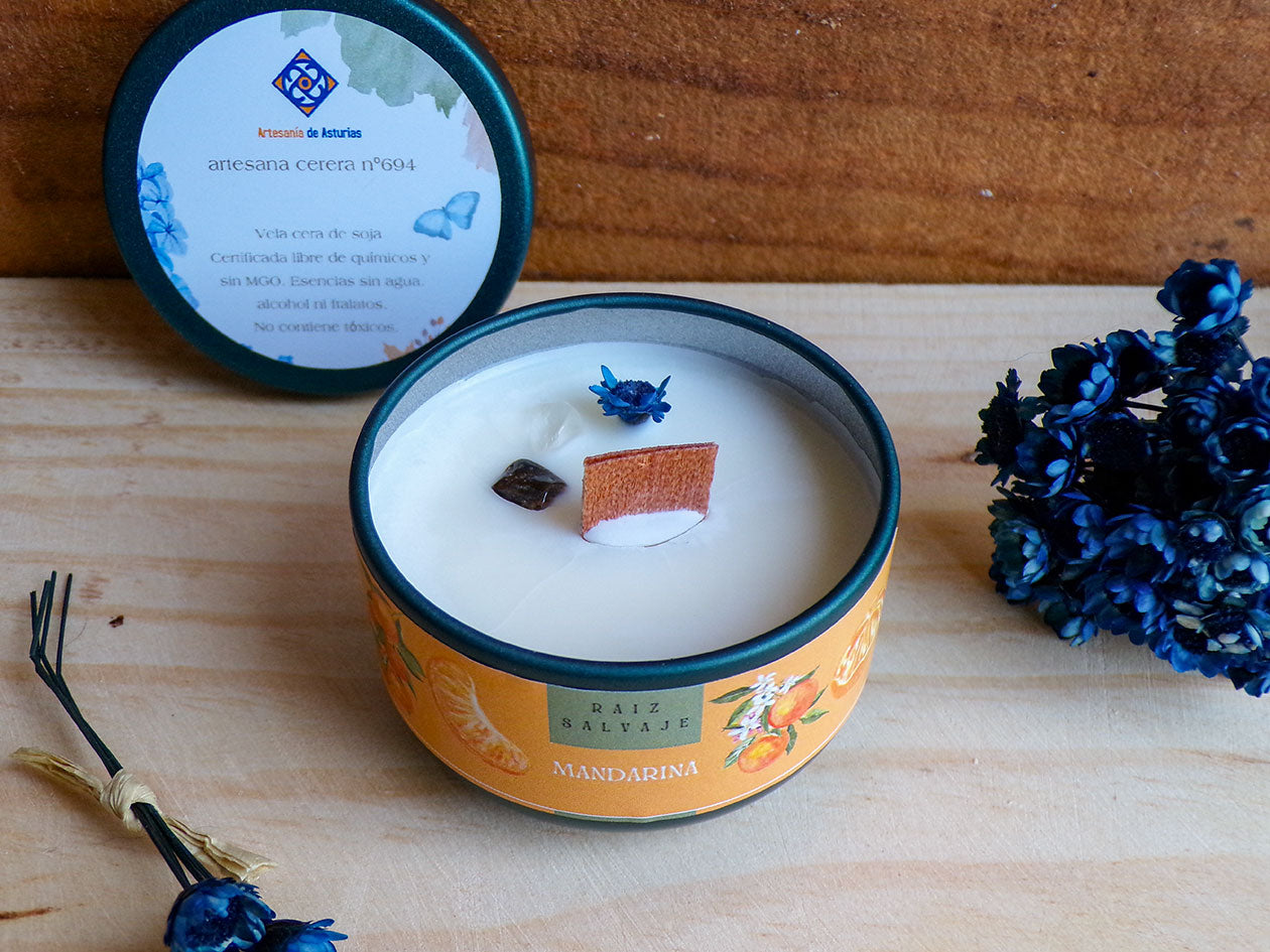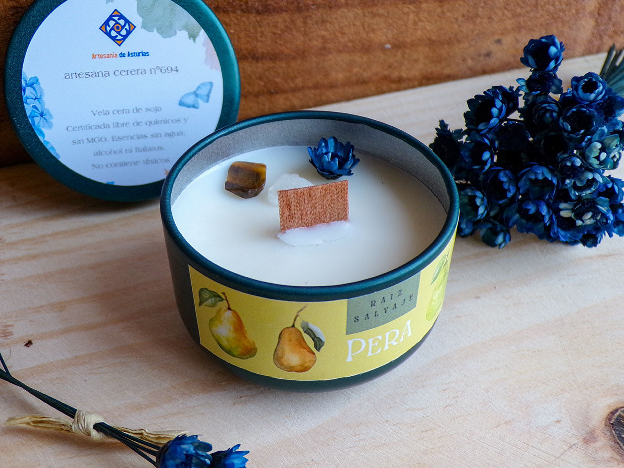 Vela natural de cera de soja. Con 4 aromas distintos entre los que elegir. Cuatro aromas nuevos, frutales y muy frescos. Vienen en una lata de 50ml de color azul océano, con dos minerales, cuarzo blanco y ojo de tigre. Además la mecha es de madera, en forma doble, para una mejor y excelente combustión.